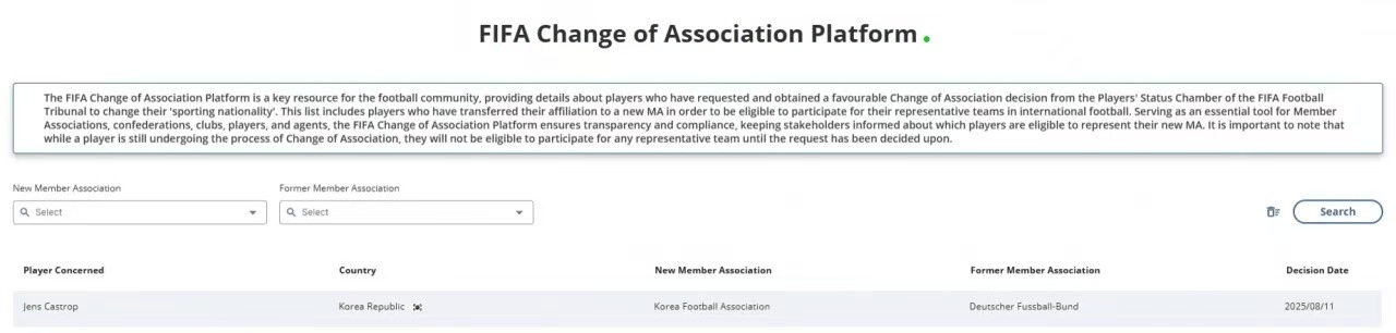 北京时间8月12日消息,根据FIFA官网显示,22岁的门兴中场卡斯特罗普的会籍已经由德国变更为韩国,他将代表韩国男足出战。