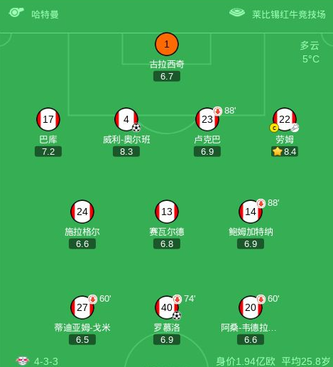莱比锡2-0弗赖堡,奥尔班 罗慕洛均头球破门,劳姆献助攻