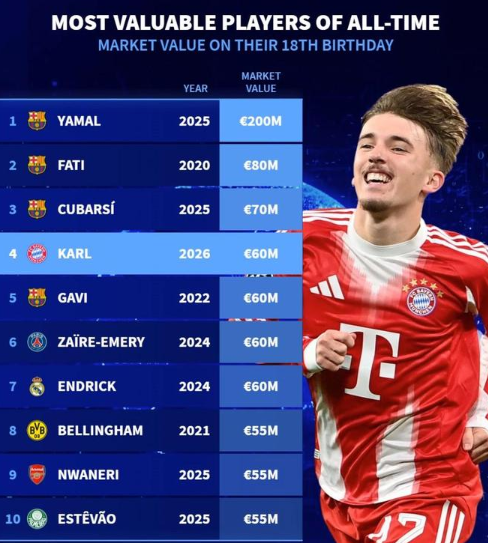 18岁球员生日当天身价榜:伦纳特-卡尔6000万欧元第4