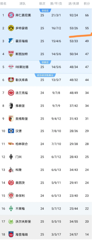 今天凌晨,德甲第25轮结束了6场较量,多特蒙德、斯图加特、勒沃库森、莱比锡等队出战,这6场较量之后,德甲积分榜发生变化,我们来看看。