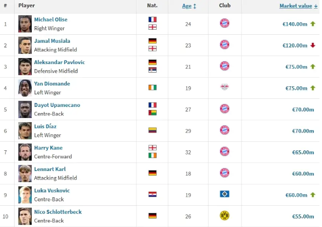 德甲球员身价前十: