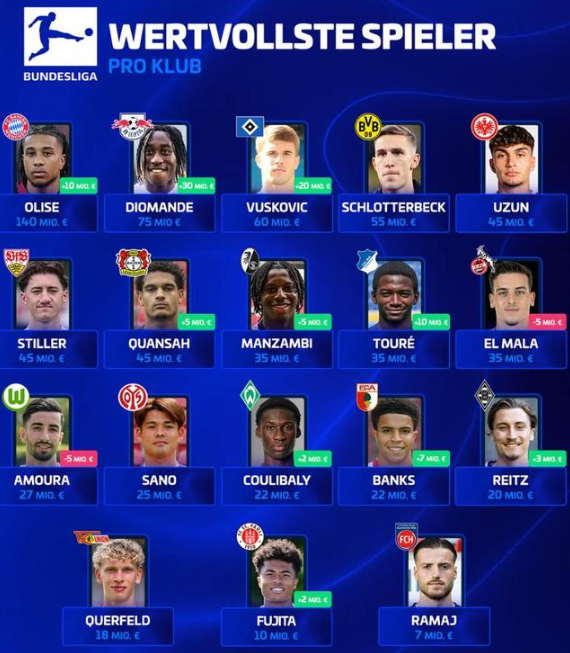 德甲20队各自身价最高球员: