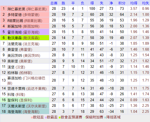 截至目前,积分榜上,拜仁以73分高居榜首,保持着23胜4平1负的骄人战绩。而多特蒙德积64分,排名第二,与领头羊相差9分,争冠形势不容乐观。莱比锡和斯图加特同为53分,排在第三和第四位,霍芬海姆则积50分名列第五。勒沃库森以49分排名第六,渴望欧冠资格的道路亟待解决。而法兰克福则以38分处于第七的位置。