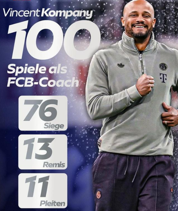 此役拜仁慕尼黑客场2-1击败皇家马德里后,孔帕尼带领球队100场比赛已取得76场胜利(13平11负)。