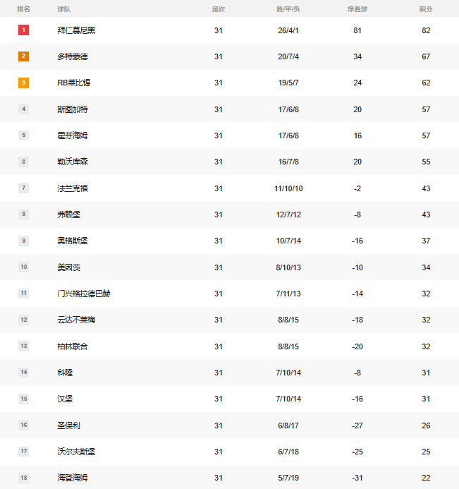 随着圣保利0-2拜仁4-3勒沃库森2-1 德甲最新积分榜出炉