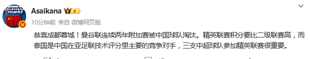 朱艺:恭喜成都蓉城!曼谷联连续两年附加赛被中国球队淘汰。精英联赛积分要比二级联赛高,而泰国是中国在亚足联技术评分里主要的竞争对手,三支中超球队参加精英联赛很重要。