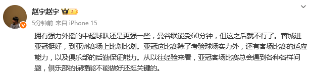 赵宇:拥有强力外援的中超球队还是更强一些,曼谷联能受60分钟,但这之后就不行了。蓉城进亚冠挺好,到亚洲赛场上比划比划。亚冠这比赛除了考验球场实力外,还有客场比赛的适应能力,以及俱乐部的后勤保证能力。从以往经验来看,亚冠客场比赛总会遇到各种各样问题,俱乐部的保障能不能做好还挺关键的。