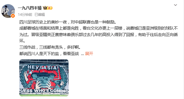 丰臻:四川足球历史上的美妙一夜,对中超联赛也是一种鼓励。