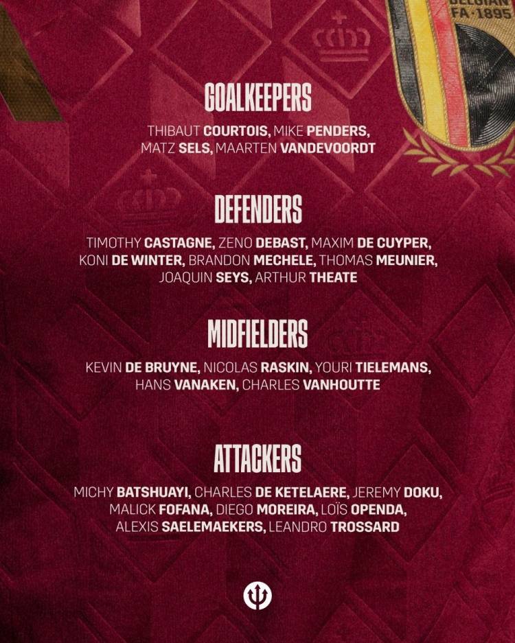 比利时9月份世预赛大名单:库尔图瓦 德布劳内 多库领衔
