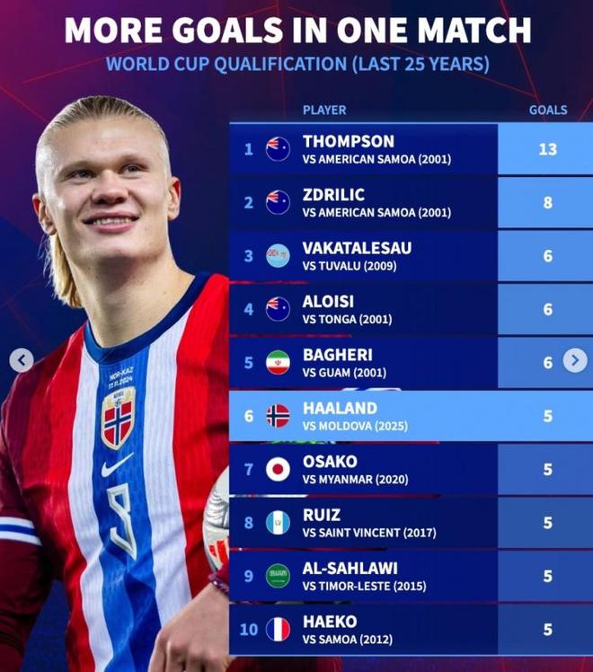 6.哈兰德(挪威),vs摩尔多瓦(2025),5球