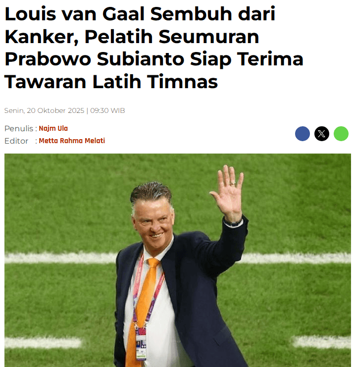 北京时间10月20日消息,据印尼当地媒体“Bola Sports”报道称:“前荷兰队主帅范加尔已从癌症中康复,并成为了印尼国家队主帅的候选人。