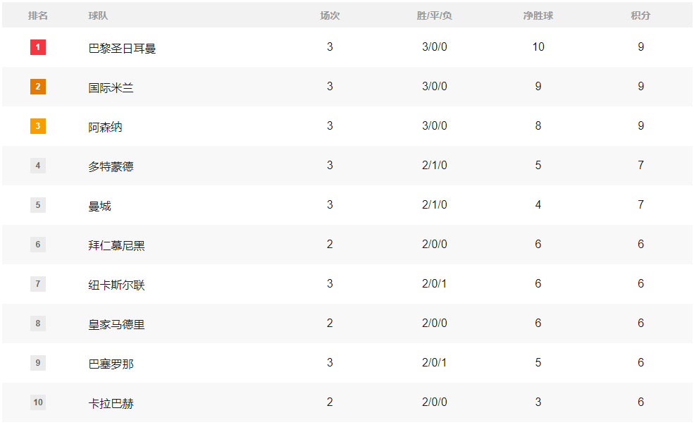 目前3战全胜的球队包括巴黎、国米、阿森纳这3支球队,他们也分列榜单的前三位。仍有机会与他们9分并驾齐驱的球队包括拜仁、皇马和大黑马卡拉巴赫。
