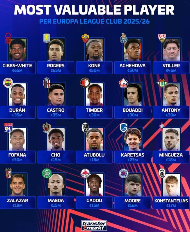 本赛季欧联杯各队身价最高球员: