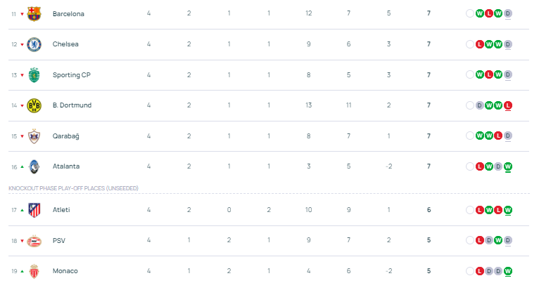 曼城3胜1平名列第四,而3胜1负的球队则包括巴黎、纽卡、皇马、利物浦以及加拉塔萨雷。