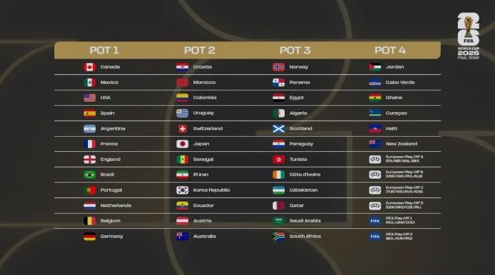 第四档:约旦、佛得角、加纳、库拉索、海地、新西兰、欧洲区附加赛A组胜者、B组胜者、C组胜者、D组胜者、附加赛1胜者、附加赛2胜者