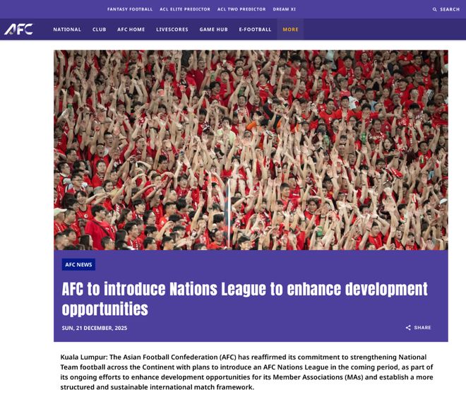 12月21日,亚足联官方宣布,为提升亚洲国家队足球水平,计划在未来一段时间推出“亚足联国家联赛”。