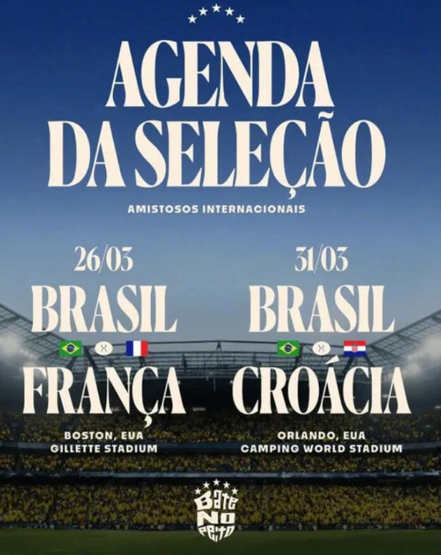 巴西国家队官方宣布,3月将在2026年世界杯的东道主国家美国举办两场友谊赛: