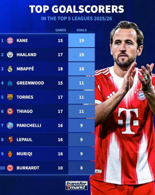 本赛季五大联赛射手榜:凯恩、哈兰德19球第1 姆巴佩第2