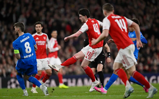 第63分钟,阿森纳扩大比分!赖斯抓住对手解围不远的机会,得球后自己带一步直接起脚远射破门,阿森纳2-0领先勒沃库森。