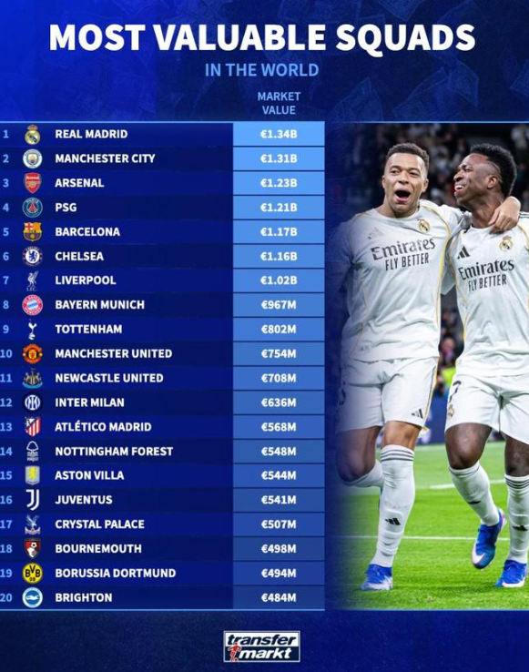世界俱乐部身价前20:皇马13.4亿欧第1,曼城第2