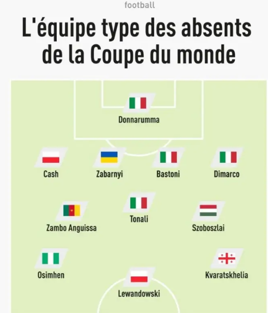 北京时间4月3日,法国《队报》评选出了无缘2026美加墨世界杯的最佳11人阵容,意大利占据首发11人中的4席,锋线由波兰前锋莱万多夫斯基领衔。
