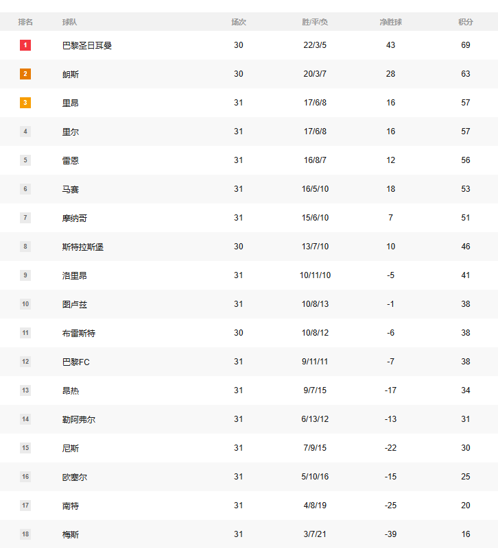 随着里尔1-0,雷恩2-1,洛里昂2-3 法甲最新积分榜出炉