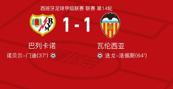 西甲-巴列卡诺1-1瓦伦西亚,诺贝尔-门迪打破僵局