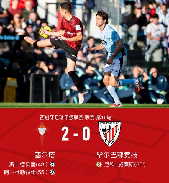 北京时间12月14日,西班牙足球甲级联赛第16轮,塞尔塔坐镇主场迎战毕尔巴鄂竞技。比赛中,哈维-鲁埃达送出精准助攻,斯韦德贝里抓住机会率先破门,为球队取得领先。随后,阿卜杜勒拉维接应队友策应,冷静施射再下一城,进一步扩大比分优势。比赛进入后段,毕尔巴鄂竞技获得点球机会,但尼科-威廉斯主罚未能命中,错失缩小差距的良机。最终,全场比分定格在塞尔塔 2-0 毕尔巴鄂竞技。