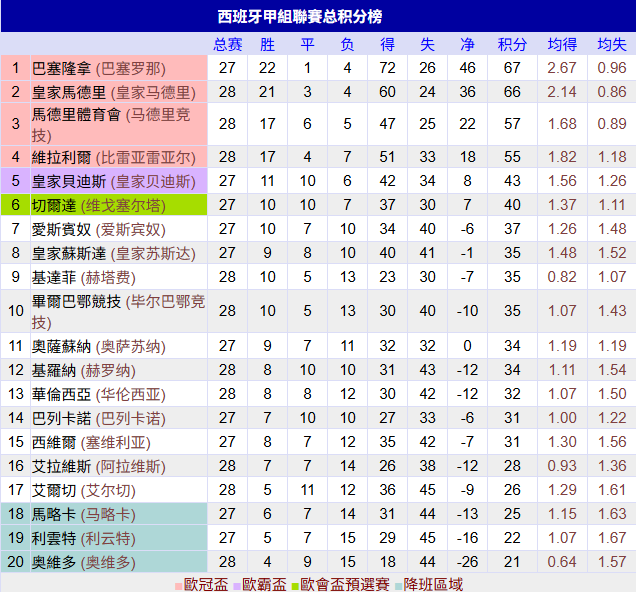 在积分榜上,巴萨继续领跑,拿到70分,战绩是23胜1平4负。巴萨继续压制皇马,领先4分。皇马以66分屈居第2名。马竞只拿到57分,排名第3。第4的是比利亚雷亚尔,拿到55分。皇家贝蒂斯只拿到一场平局,总积分是44分,排名第5,与身前的球队差距巨大。塞尔塔总积分41分,排第6。