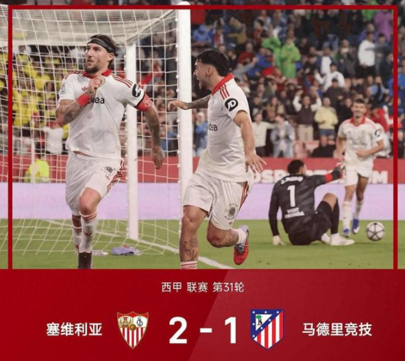 4月12日25/26赛季西甲联赛第31轮,上半场罗梅罗造点,亚当斯点射破门,博纳头球扳平比分,补时阶段古德利头球破门再度将比分超出。最终塞维利亚2-1战胜马德里竞技。积分方面马竞57分仍然第四,塞维利亚34分领先降级区3分优势!