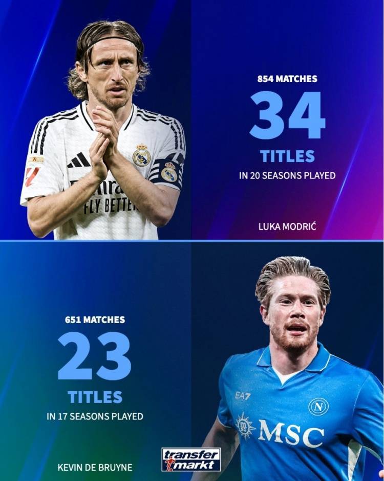 7月22日讯 那不勒斯和米兰在今夏先后签下德布劳内和莫德里奇,数据统计显示这两位顶级中场的生涯履历无比耀眼: