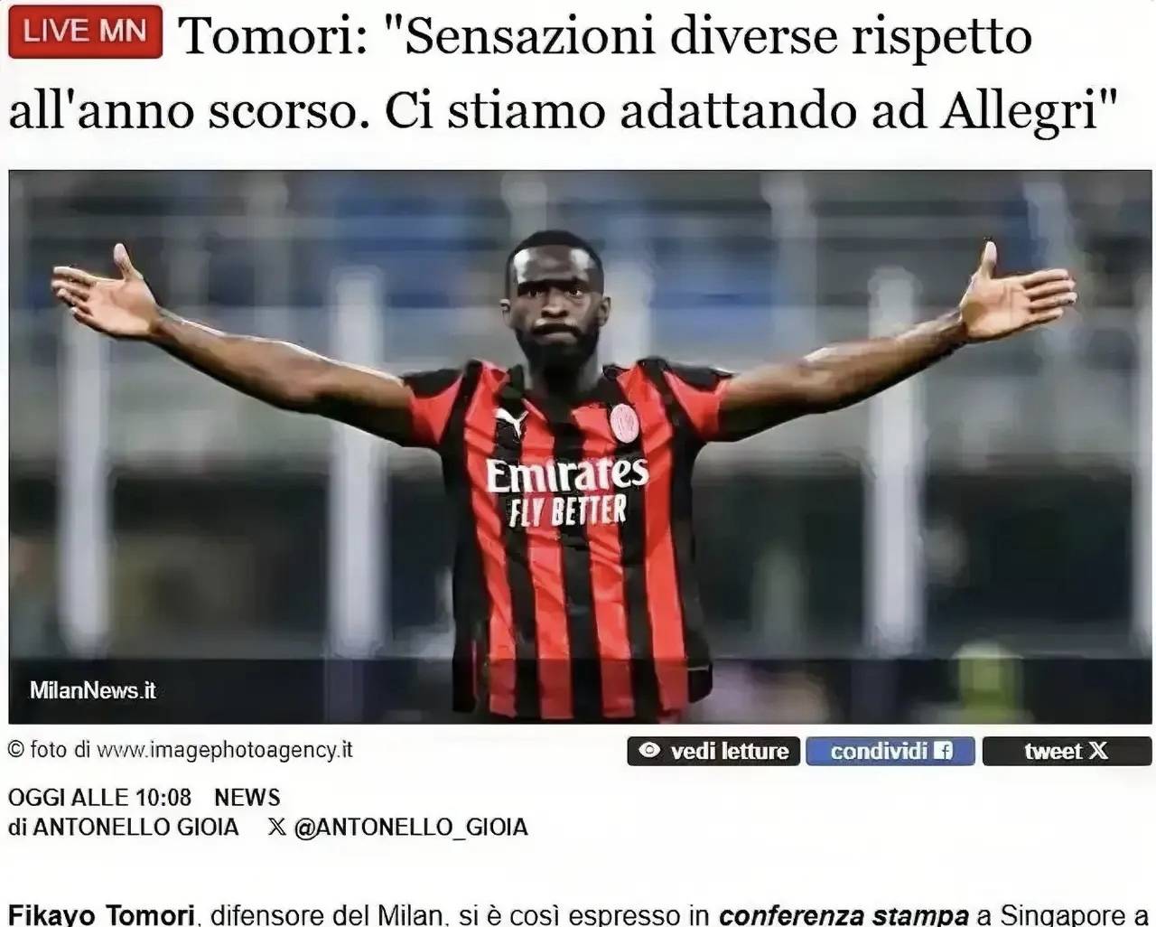 托莫里表示我正在努力去适应阿莱格里战术,我现在的感觉与上赛季的感受完全不同。托莫里意思我理解为我现在想留在米兰,适应阿莱格里战术,努力去竞争主力位置。