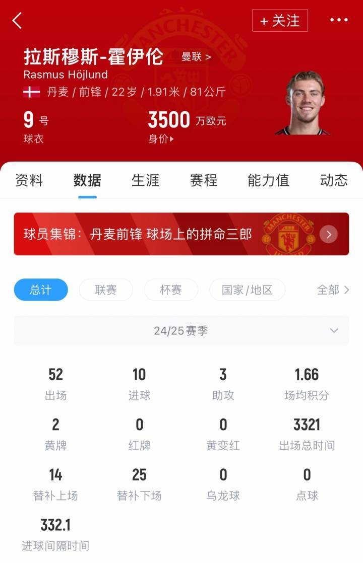 霍伊伦时年22岁,上赛季为曼联出场52场,取得10粒进球和3次助攻,目前其德转身价为3500万欧。