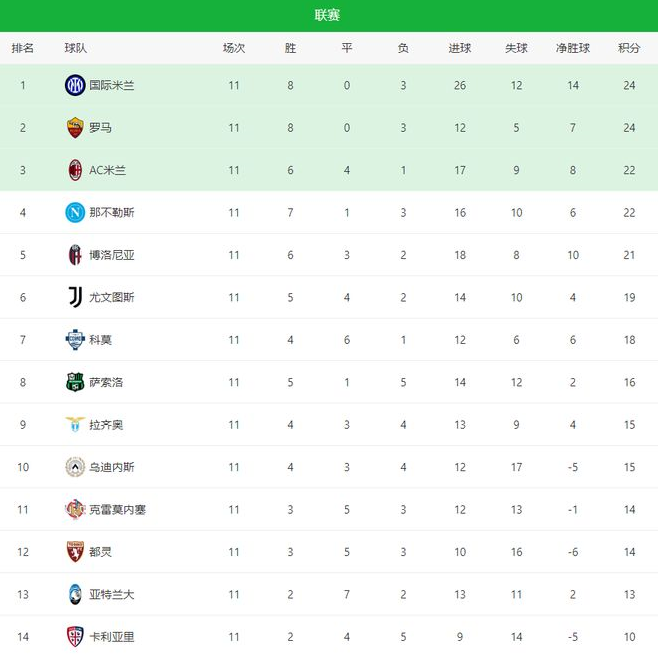 本赛季的意甲联赛争冠争四异常的激烈,没有一枝独秀的球队,前5球都分差咬得非常的紧,一场比赛的结束,就瞬间让积分榜大变样,确实是近年来少有的刺激。联赛第11轮多场比赛在今天同时结束,竞争格局彻底乱了套:卫冕冠军那不勒斯客场爆冷不敌博洛尼亚;罗马坐镇主场稳稳拿下乌迪内斯再度反超AC米兰;而国际米兰则在强强对话中轻松击败拉齐奥,最终凭借净胜球优势成功跃居榜首位置。