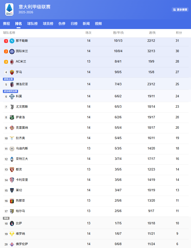 北京时间12月8日凌晨,2025-26赛季意甲联赛第14轮再赛4场。经过一番鏖战,那不勒斯主场2:1绝杀尤文,罗马客场0:1不敌卡利亚里,克雷莫纳主场2:0完胜莱切,博洛尼亚客场1:1战平拉齐奥。