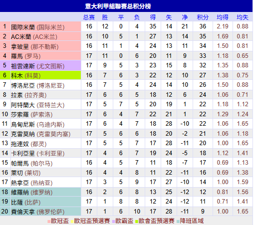 目前,意甲前三因为意大利超级杯赛事均少赛一场,国米以1分优势登顶,米兰和那不勒斯紧随其后,罗马排在第四位,尤文图斯在换帅后成绩有所提升,暂时排在第五位。