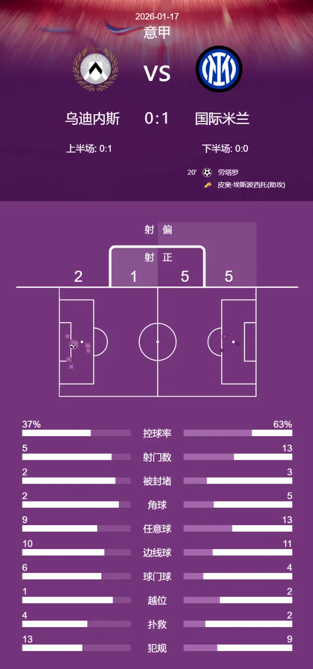 北京时间2026年1月17日22:00,意甲第21轮,乌迪内斯主场迎战国际米兰。上半场,劳塔罗接皮奥·埃斯波西托助攻打破僵局。下半场双方互有攻守但均未能改写比分。最终,国际米兰客场1-0小胜乌迪内斯,继续稳居积分榜首位。
