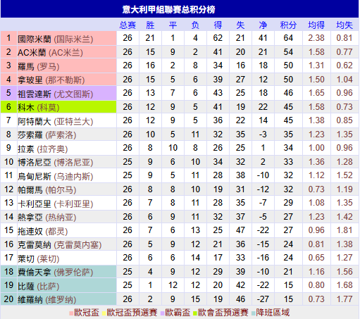 随着这两场1-0的比赛结束,意甲第26轮后的积分榜格局变得更加清晰。 在积分榜的最顶端,国际米兰依然是一骑绝尘。他们在此前一天的比赛中2-0击败莱切,豪取联赛7连胜。 在先赛一场的情况下,蓝黑军团的积分已经达到了64分,这是一个令人望而生畏的数字。
