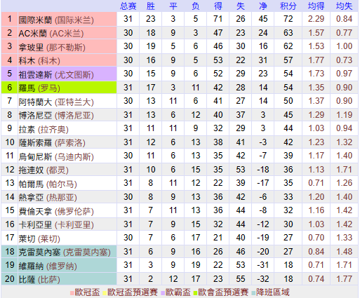 在积分榜上,国际米兰以72分高居榜首,战绩是23胜3平5负。AC米兰排名第2,只拿到63分。国际米兰在多赛一场的情况下领先AC米兰9分。这样的领先优势很大了。冠军恐无悬念。那不勒斯排名第3,拿到62分。第4名的是法布雷加斯率领的大黑马科莫,拿到57分。尤文图斯54分排第5。罗马输球之后,依然是54分,排名第6,想要获得欧冠资格难度变得更大了。