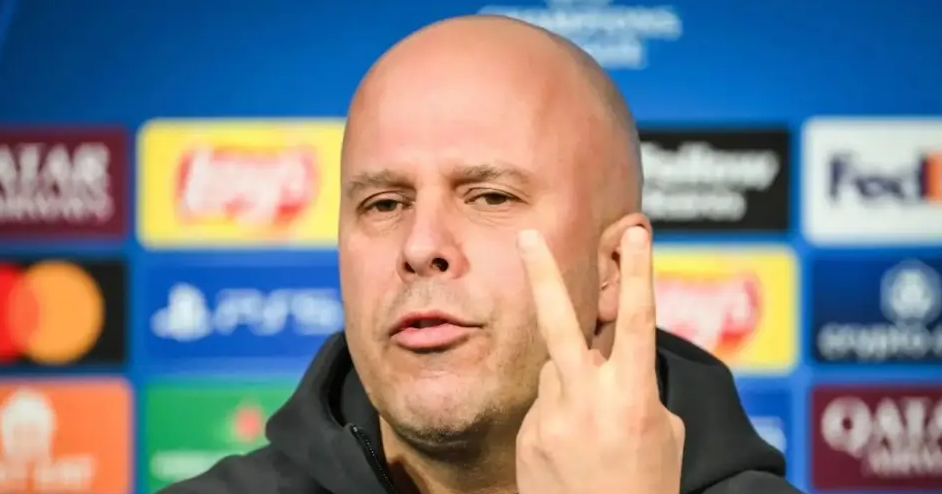 阿恩·斯洛特 (Arne Slot) 在新闻发布会上举起了两根手指。
