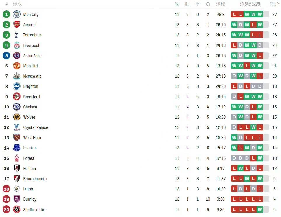 英超最新积分榜:阿森纳暂列第二,热刺降至第三
