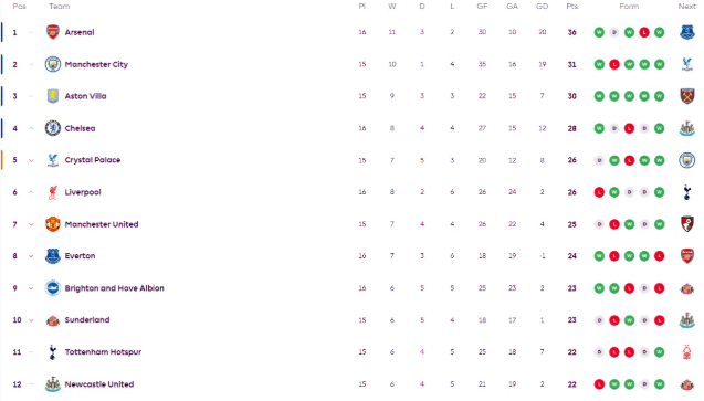 北京时间12月14日,英超第16轮先赛几场,积分榜情况如下: