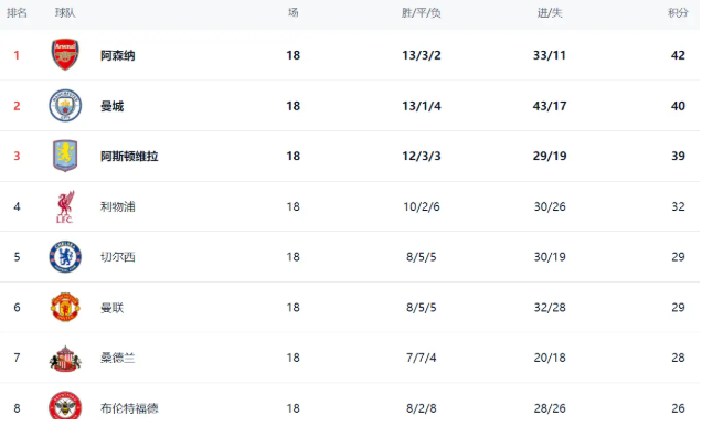 在积分榜上,阿森纳的战绩是13胜3平2负,以42分高居榜首。不过,阿森纳的领先优势很少,身后的曼城追得很紧。曼城总积分是40分,排名第2,只落后阿森纳2分。第3名的阿斯顿维拉的战绩也是极其出色,拿到39分,比阿森纳只少3分。现在的争冠格局就是三国鼎立,每一轮比赛的结果都有可能导致榜首的易主。