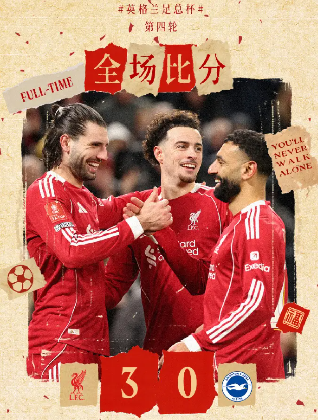 北京时间2月15日04时,2025-26赛季英格兰足总杯第4轮继续进行,利物浦坐镇安菲尔德球场3-0战胜布莱顿,晋级第5轮。琼斯第42分钟打破僵局,萨拉赫先是在第56分钟助攻索博斯洛伊得分,然后第68分钟主罚点球命中锁定胜局。