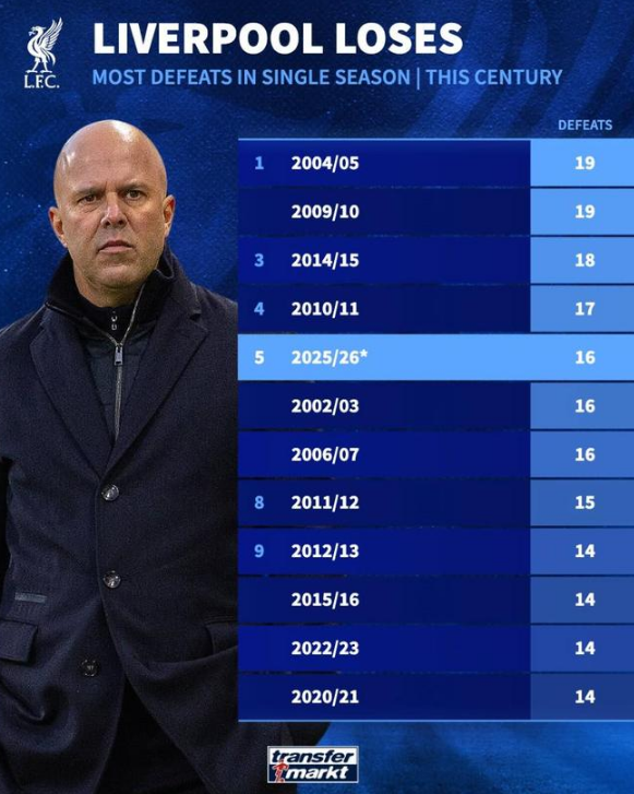 利物浦本赛季各项赛事已经输16场,为本世纪第五多
