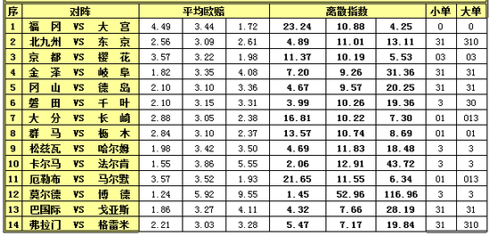 大宫当前排名高居榜首战绩不俗,客场也有极高胜率,此役对手福冈虽实力不弱,但与大宫相比还是有显著差距。从本场离散指数形态来看,胜平居高,客胜处于低位,大宫看来赢面不低。