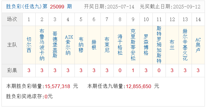 足彩25099期开奖结果:一等奖14注 单注奖金49.8万元