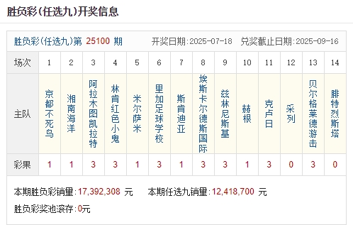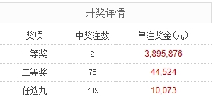 足彩25100期开奖结果:一等奖2注 单注奖金389.5万元