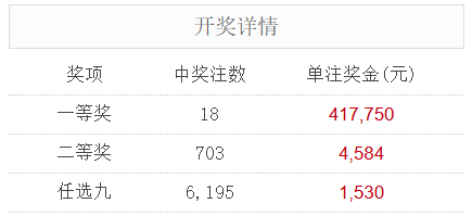 北京时间8月11日,足彩25110期开奖。本期全国中出一等奖18注,每注奖金417,750元,二等奖中出703注,每注奖金4,584元。另外,任选9场中出6,195注,每注奖金1,530元。