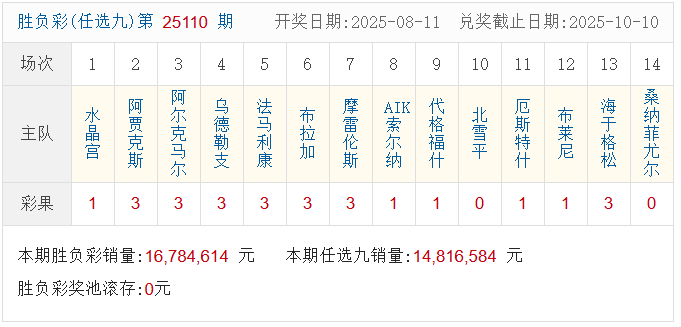 本期足彩销量16,784,614元,本期任选九销量14,816,584元,开奖结束后,足彩奖池滚存0元。